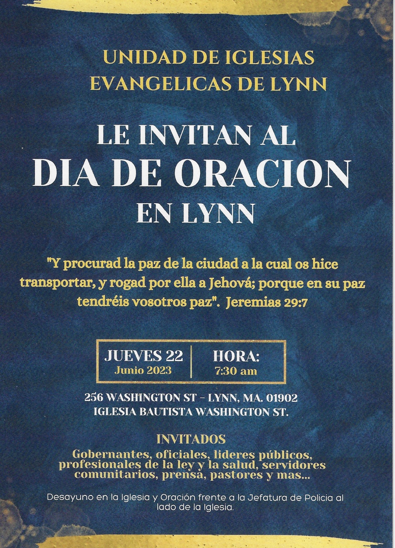 Un evento anual que pastores unidos junto a lideres de la ciudad, servidores públicos, profesionales de la salud, educación, trabajo, seguridad y comunidad se reúnen para desayunar juntos y hacer una oración en común, al finalizar este año oraremos enfrente del edificio de la Jefatura de Policia de Lynn.